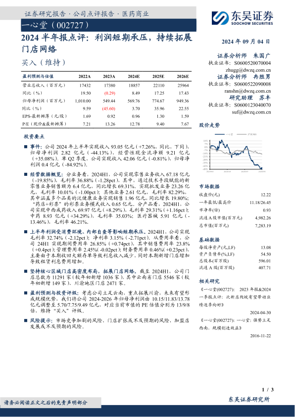 尽管短期利润承压,但考虑到一心堂在西南地区的领先地位和未来发展潜力,维持对公司“买入”评级。