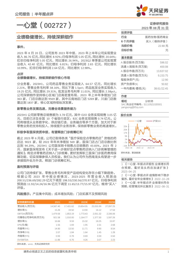 大参林2023年上半年业绩表现稳健,通过持续的门店扩张和积极的市场策略,实现了营收和利润的显著增长。公司在省外市场的拓展以及对处方外流趋势的把握,为其未来的发展奠定了坚实的基础。天风证券维持对大参林的“买入”评级,并上调了盈利预测,反映了对公司未来发展的信心。