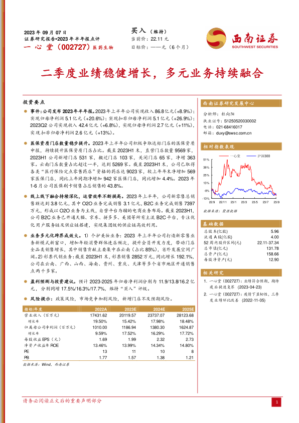 基于公司上半年的良好表现和未来的发展潜力,西南证券分析师对一心堂的盈利能力持乐观态度。预计2023年至2025年,公司归属于母公司股东的净利润将分别达到11.9亿元、13.8亿元和16.2亿元。相应的同比增长率分别为17.5%、16.3%和17.7%,显示出持续稳定的增长预期。鉴于此,分析师维持对一心堂的“买入”评级。