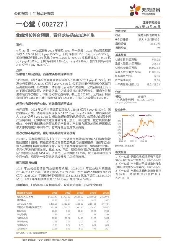 一心堂2022年业绩符合预期,作为西南龙头药店,公司在门店扩张、区域深耕、中药产业链布局等方面具备显著优势。医保政策的深化将为公司带来新的发展机遇。虽然报告下调了公司未来两年的盈利预测,但维持“买入”评级,看好公司长期发展前景。投资者需关注门店拓展、政策变动和药品安全等风险因素。