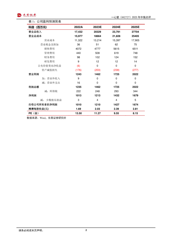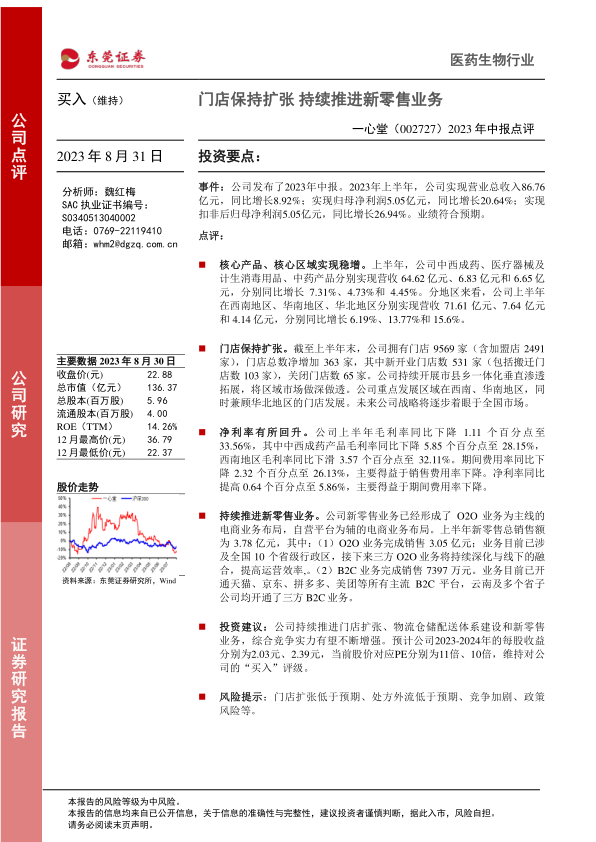 一心堂2023年中报显示,公司在核心业务和区域市场保持稳健增长,门店数量持续扩张,新零售业务发展迅速。尽管毛利率有所下降,但期间费用率的降低带动净利率回升。东莞证券维持对一心堂“买入”评级,并看好公司未来的发展前景。投资者应关注门店扩张速度、处方外流政策、市场竞争以及其他潜在风险。