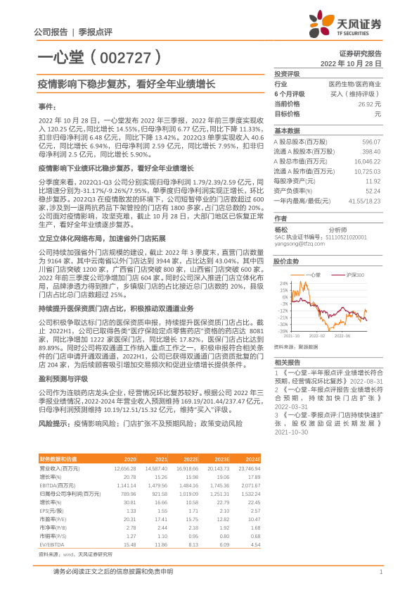 一心堂2022年三季报显示,公司在疫情影响下业绩稳步复苏,省外门店扩张加速,医保资质门店占比提升,双通道业务积极推进。维持此前对公司2022-2024年营业收入和归母净利润的预测,维持“买入”评级。投资者需注意疫情影响、门店扩张不及预期以及政策变动等风险。