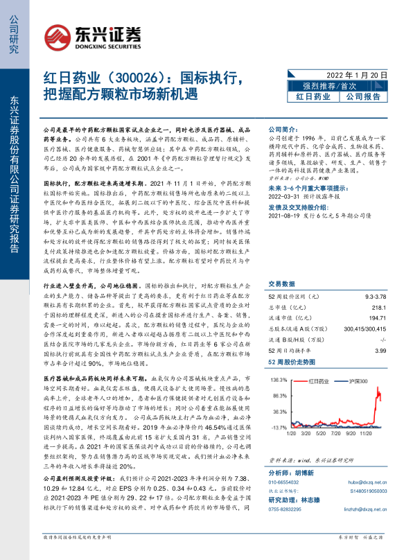 公司盈利预测及投资评级: 我们预计公司 2021-2023 年净利润分别为 7.38、10.29 和 12.84 亿元,对应 EPS 分别为 0.25、 0.34 和 0.43 元。当前股价对应 2021-2023 年 PE 值分别为 29、 22 和 17 倍。公司配方颗粒业务受益于国标执行下的销售渠道和处方权的放开、对中成药和中药饮片的市场替代,同时具有较好的提价预期,我们看好公司配方颗粒业务高速增长, 医疗器械和成品药板块同样未来可期, 首次覆盖给予“强烈推荐”评级。