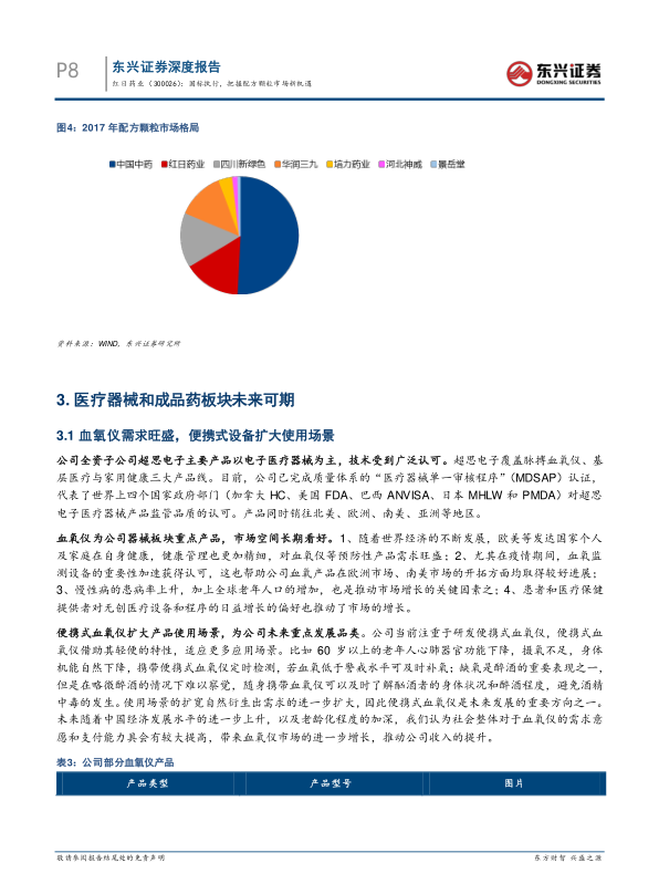 医疗器械和成品药板块同样未来可期。 血氧仪为公司器械板块重点产品,市场空间长期看好。 血氧仪需求旺盛,便携式设备扩大使用场景。 慢性病的患病率上升,全球老年人口的增加, 患者和医疗保健提供者对无创医疗设备和程序的日益增长的偏好等均推动了市场的增长; 同时公司着重在能拓展使用场景的便携式血氧仪方向发力。 公司成品药板块主打产品为血必净, 血必净国谈续约成功,增长空间长期看好。 2019 年血必净降价约 46.54%通过医保谈判纳入国家医保,终端覆盖由此前 15 省扩大至国内 31 省,产品销售空间进一步提高。在 2021 年的国家医保谈判中成功以目前的价格续约,公司也调整组织架构,努力在销售潜力高的区域市场实现突破。我们预计血必净未来三年的年收入增长率将接近 20%。