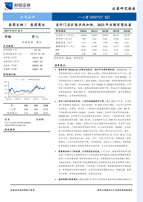 本报告对一心堂(002727.SZ)进行了专业分析,指出公司2022年业绩受疫情影响出现波动,但随着疫情管控放开和医疗消费需求恢复,2023年业绩有望改善。公司正加速省外门店扩张,优化区域布局,并受益于人口老龄化等因素带来的中长期坪效提升潜力。同时,国家医保局将零售药店纳入门诊统筹的政策将为公司带来显著利好,进一步巩固其作为行业龙头的市场地位。基于对公司未来业绩的积极预测和估值分析,报告首次覆盖并给予一心堂“买入”评级,目标价格区间为39.20-49.00元/股,但同时提示了疫情、门店扩张、行业竞争、医药电商冲击及政策变化等潜在风险。