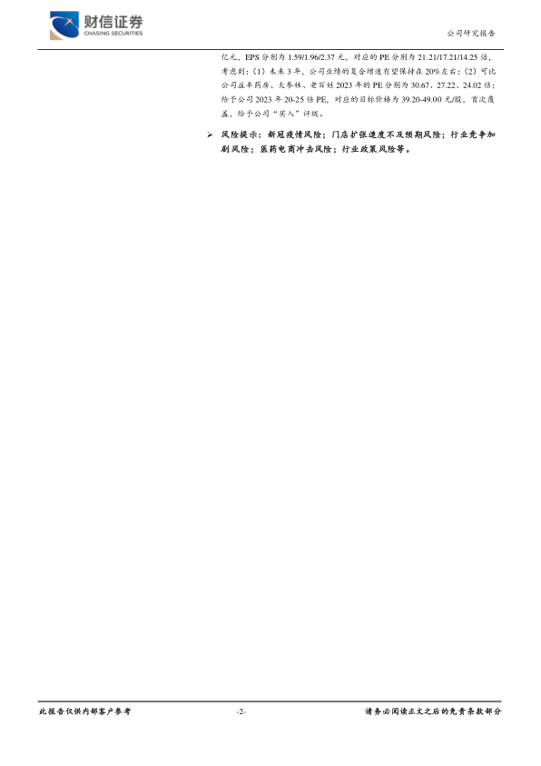 风险提示:新冠疫情风险;门店扩张速度不及预期风险;行业竞争加剧风险;医药电商冲击风险;行业政策风险等。