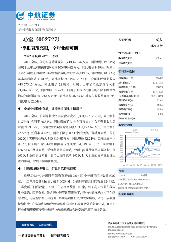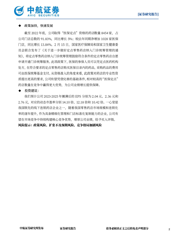 我们预计公司2023-2025年摊薄后的EPS分别为2.04元、2.36元和2.76元,对应的动态市盈率分别14.10倍、12.18倍和10.42倍。一心堂是我国领先的线下连锁药店企业之一,随着我国零售药店市场规模和连锁化率的逐年提升,作为具备精细化管理和门店标准化复制能力的企业,公司有望在市场竞争中持续构建核心竞争优势,增厚公司业绩,给予买入评级。