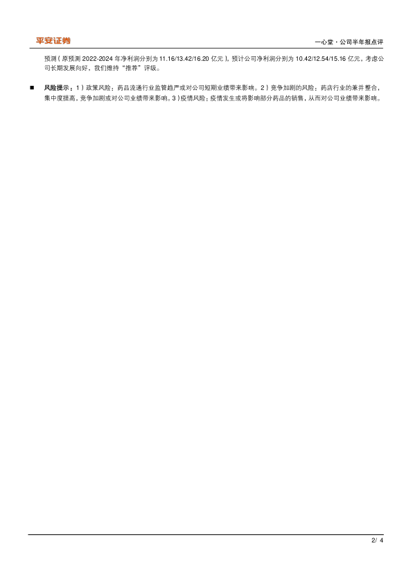 维持“推荐”评级:公司作为西南地区市占率最高的连锁药店,卡位优势越来越明显。限制性股票激励计划将有效激发公司新管理层动力,促进业绩提速增长。考虑疫情对公司业绩的影响,我们下调2022-2024年的盈利预测(原预测2022-2024年净利润分别为11.16/13.42/16.20亿元),预计公司净利润分别为10.42/12.54/15.16亿元,考虑公司长期发展向好,我们维持“推荐”评级。