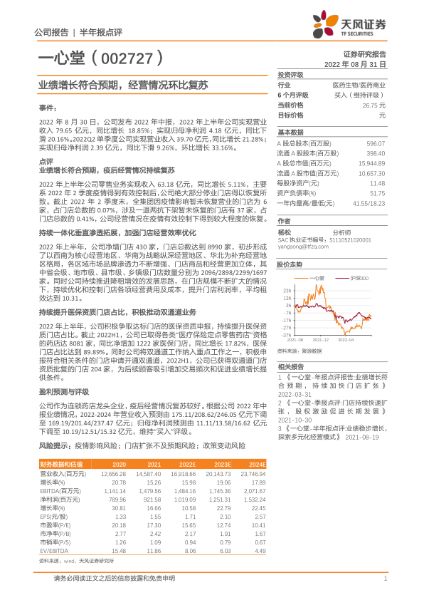 一心堂在2022年上半年展现出符合预期的业绩增长,尤其在第二季度,随着疫情的有效控制,公司经营状况实现显著复苏。公司通过持续的门店网络扩张,上半年净增430家门店,总数达到8990家,并形成了多层次的区域市场布局,同时积极推行降租增效以优化经营效率。在市场竞争力方面,一心堂大力提升医保资质门店占比至89.89%,并成功获得204家双通道门店资质,为吸引顾客和促进业绩增长奠定了基础。尽管分析师基于中期业绩对未来盈利预测进行了调整,但仍维持“买入”评级,表明对一心堂作为行业龙头长期发展潜力的认可,同时提示了疫情、门店扩张和政策变动等潜在风险。