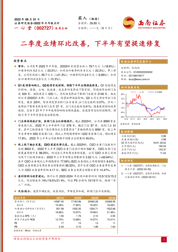 一心堂2022年上半年业绩受到疫情影响,但二季度已呈现环比改善态势。公司通过持续的门店扩张、医保门店占比提升以及线上线下融合发展,展现出较强的增长潜力。 预计下半年业绩有望加速修复,维持“买入”评级,但需关注疫情、政策及市场竞争等风险因素。