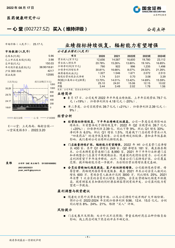本报告分析了一心堂2022年半年度业绩快报,指出公司经营指标持续恢复,门店数量扩张,会员运营精细化程度提高,业绩确定性较强。预计公司未来几年归母净利润将保持增长,维持“买入”评级。同时,报告也提示了门店发展、处方外流、带量采购以及线上药店冲击等风险因素。