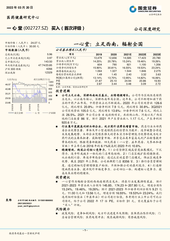 一心堂作为辐射全国的西南连锁药店龙头,将在行业发展持续获益。预计2021-2023年营业收入分别为145.85、174.23和207.80亿元,增速分别为15.24%,19.46%,19.26%;预计2021-2023年归母净利润分别为9.21亿元、11.00亿元和13.56亿元,增速分别16.55%、19.53%和23.24%。我们选用相对估值法(市盈率法)对公司进行估值,参考同行业上市公司可比公司情况,给予公司2022年17倍PE,目标价31元,首次覆盖给予公司“买入”评级。