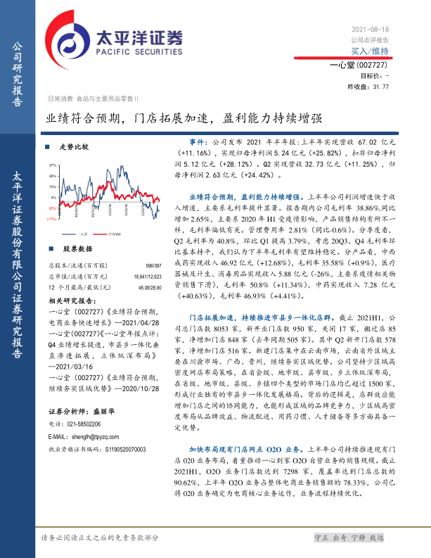 一心堂2021年半年报业绩符合预期,门店拓展加速,盈利能力持续增强。