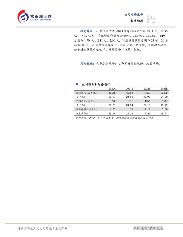 投资建议:我们预计2021-2023年净利润分别为10.11亿、12.56亿、15.47亿元,同比增速分别为28.04%、24.16%、23.22%,EPS分别为1.70元、2.11元、2.60元,对应当前股价分别为24倍、20倍和16倍PE。公司经营效率提升,区域优势不断夯实,业绩增长提速,处于历史估值中枢偏下。继续给予“推荐”评级。