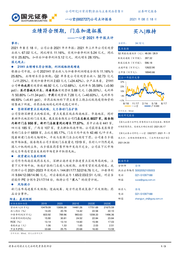 本报告对一心堂(002727)2021年中报进行了深入分析,核心观点如下: