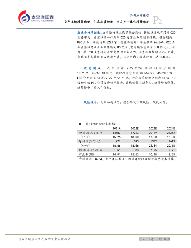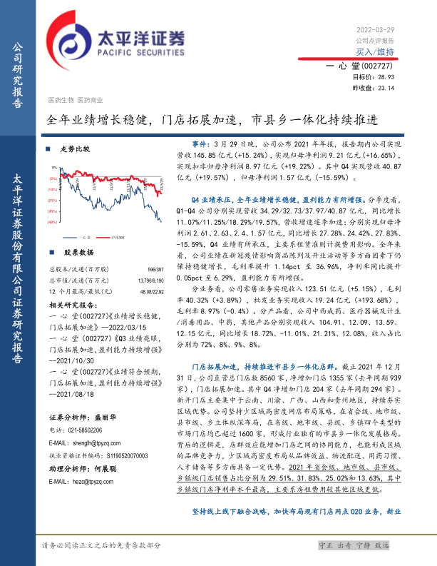一心堂2021年业绩表现稳健,通过加速门店扩张、深化市县乡一体化战略以及积极发展线上线下融合业务,实现了营收和利润的双增长。公司盈利能力有所提升,O2O业务发展迅速,未来发展前景可期。维持“买入”评级,并看好公司未来的增长潜力。