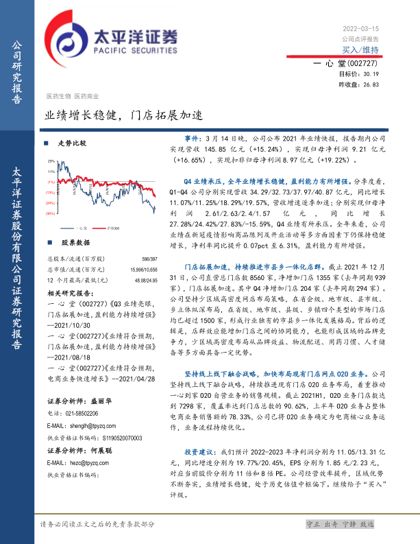 一心堂2021年业绩表现稳健,门店拓展加速,线上线下融合战略有效推进。尽管Q4业绩有所承压,但全年来看,公司盈利能力有所增强。公司坚持区域深耕和店群策略,未来发展潜力巨大。维持“买入”评级,但需关注行业竞争、整合风险和政策变化。