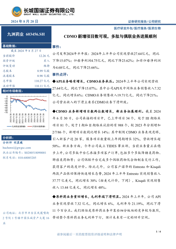 考虑公司原料药板块毛利率下滑及CDMO业务承压,我们下调公司2024-2026年的归母净利润分别为10.25/11.87/12.41亿元(原为12.62/14.24/15.48亿元),EPS分别为1.06/1.23/1.29(原为1.31/1.48/1.60元),当前股价对应PE为12/10/10倍。考虑CDMO业务各阶段项目增长良好,部分商业化大品种受益于终端市场放量、销量持续增长,未来有望保持增长态势;我们维持其“买入”评级。