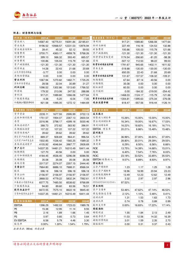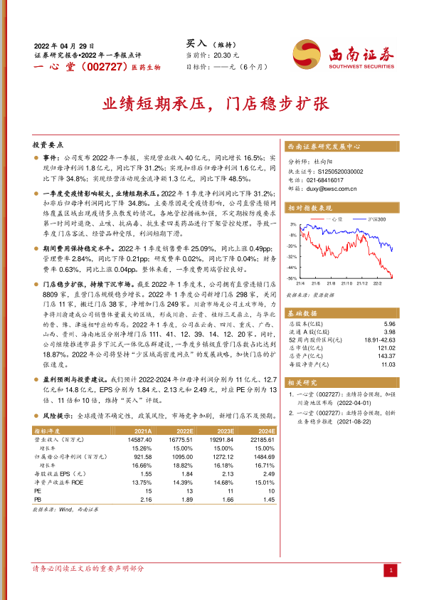 2021年,公司营收同比增长14.9%,但归母净利润同比下降21.4%。这主要归因于广东地区疫情影响较大,政府管控趋严,导致部分药物销售、门店客流及物流运输受限。随着疫情逐步好转,2022年一季度业绩复苏趋势明显,预计全年将迎来业绩的全面复苏。
