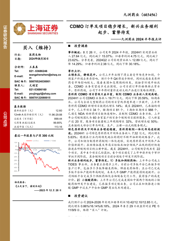 九洲药业2024半年报点评:CDMO订单及项目稳步增长,新兴业务顺利起步、蓄势待发
