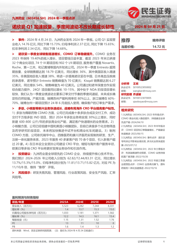 九洲药业2024年第一季度业绩虽受订单交付节奏影响出现短期波动,但其核心CDMO业务的稳健增长态势未变,与诺华等国际制药巨头的深度合作持续深化,诺欣妥等重磅产品在全球市场的加速放量为公司带来了显著的增长动力。同时,公司在多肽、小核酸、制剂CDMO等新兴业务领域的积极布局和快速成长,以及通过设立海外CRO平台拓展全球市场的战略举措,共同构筑了其多元化的增长引擎和强大的市场竞争力。尽管面临研发、管理、政策、安全生产及汇率等多重风险,但基于其在全球CDMO领域的领先地位和清晰的成长路径,公司未来业绩增长的确定性较强,因此维持“推荐”评级。