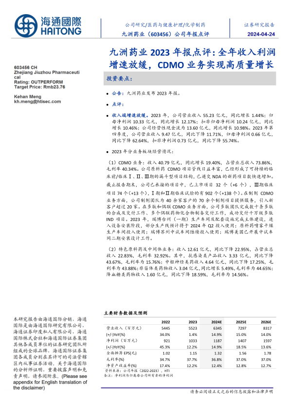 九洲药业2023年报点评:全年收入利润增速放缓,CDMO业务实现高质量增长