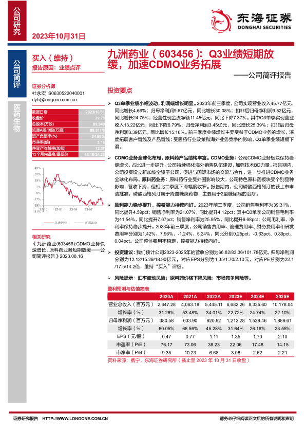 2023年前三季度,九洲药业实现营业收入45.77亿元,同比增长4.66%;归母净利润9.67亿元,同比增长30.08%;扣非后归母净利润9.52亿元,同比增长24.75%。经营性现金流净额为11.45亿元,同比下降7.37%。 其中,Q3单季实现营业收入13.22亿元,同比下降6.79%;归母净利润3.45亿元,同比增长25.39%;扣非后归母净利润3.39亿元,同比增长15.16%。前三季度业绩增长主要受益于CDMO业务的拓展,而Q3单季业绩下滑则受医药行业政策和海外业务竞争影响。