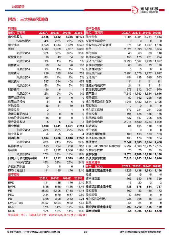 投资建议:我们预计公司2023-2025年的营收分别为66.82/83.36/101.78亿元,归母净利润分别为12.12/15.29/18.90亿元,对应EPS分别为1.35/1.70/2.10元,对应PE分别为22.1/17.5/14.2倍,维持“买入”评级。