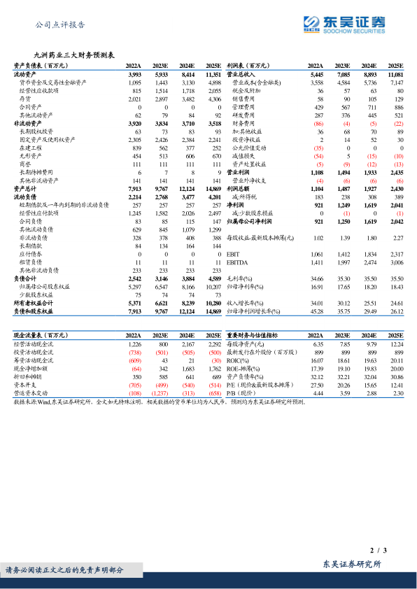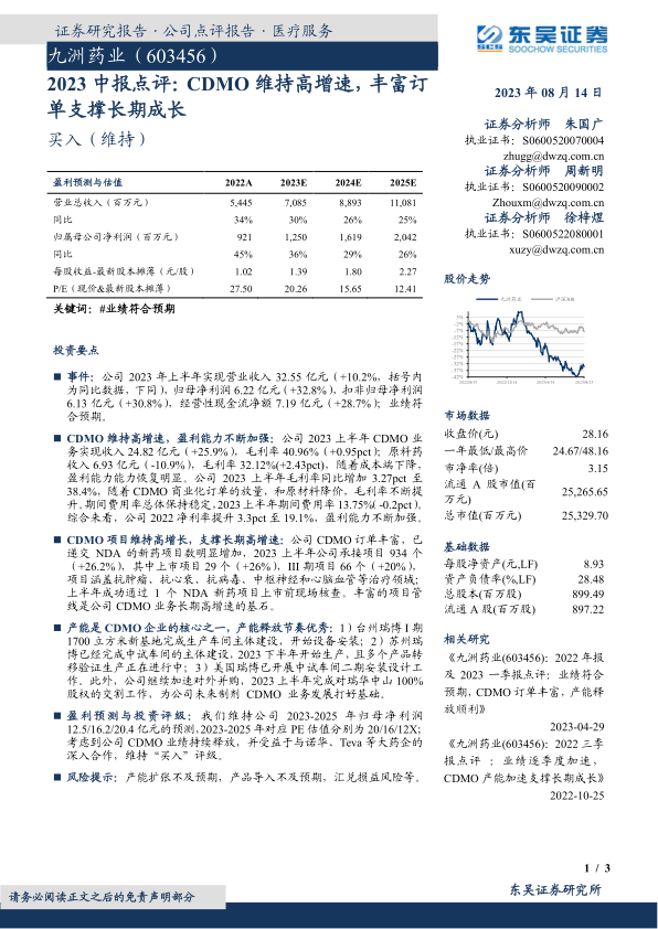 九洲药业2023年中报显示业绩符合预期,CDMO业务维持高增速,盈利能力不断加强。公司CDMO订单丰富,产能扩张顺利,为长期高增长提供支撑。维持公司2023-2025年盈利预测和“买入”评级。