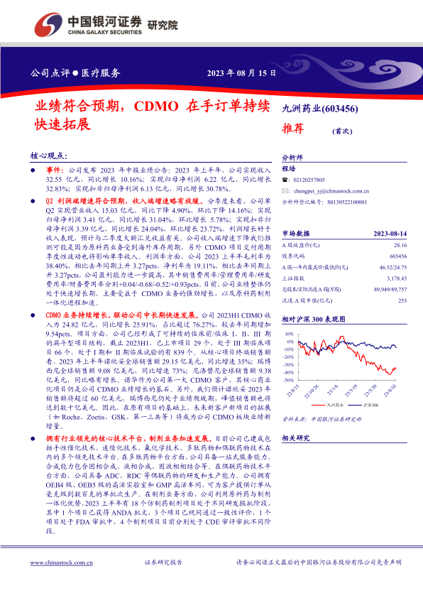 九洲药业2023年中报业绩符合预期,CDMO业务持续增长是公司发展的核心驱动力。公司在新领域和新业务的拓展,以及与下游药企的紧密合作,将推动公司持续发展。