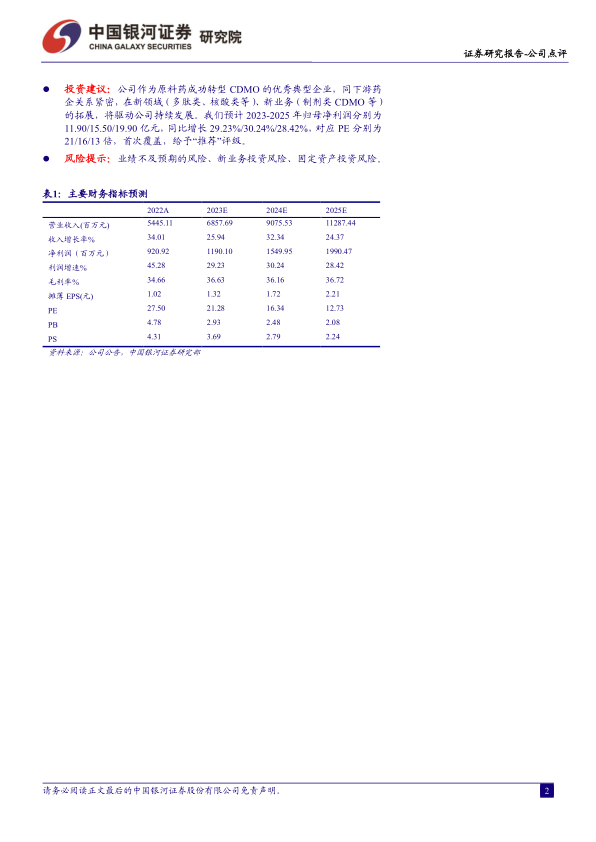 投资建议: 公司作为原料药成功转型 CDMO 的优秀典型企业,同下游药企关系紧密,在新领域(多肽类、核酸类等)、新业务(制剂类 CDMO 等)的拓展,将驱动公司持续发展。 我们预计 2023-2025 年归母净利润分别为11.90/15.50/19.90 亿元, 同比增长 29.23%/30.24%/28.42%, 对应 PE 分别为21/16/13 倍, 首次覆盖,给予“推荐”评级。