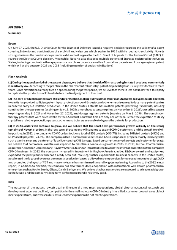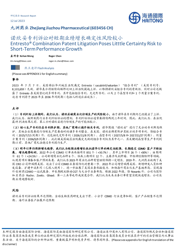 本报告分析了九洲药业(603456 CH)面临的诺欣妥(Entresto®)专利诉讼,并评估了其对公司短期和长期业绩的影响。核心观点如下: