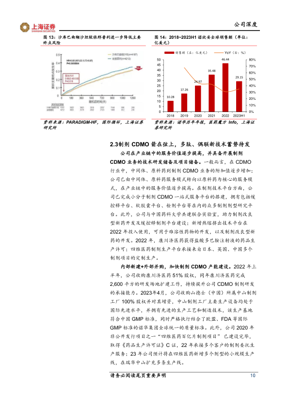 九洲药业拥有优质且丰富的客户群体,与Novartis、Roche、Zoetis、Gilead、第一三共等国际知名药企以及贝达药业、和记黄埔等国内研创药企建立了深厚的合作关系。公司是Novartis的战略供应商之一,自上世纪90年代起便与其合作,并于2019年收购苏州诺华制药100%股权,进一步深化了合作。诺华的沙库巴曲缬沙坦(诺欣妥®)是全球首个血管紧张素受体脑啡肽酶抑制剂(ARNI),用于心衰治疗,并于2021年新增原发性高血压适应症。诺欣妥®在全球市场表现强劲,2018-2022年全球销售额复合年增长率超过45%,2023年上半年销售总额达29.15亿美元,同比增长35%。在中国市场,诺欣妥®销售额在2021年首次突破20亿元,同比增长127.62%。诺欣妥®终端销量的显著增长直接拉动了九洲药业作为上游原料药供应商的需求。此外,诺华治疗乳腺癌和白血病等药物的原料药生产转移工作完成,预计2023-2024年进入正常商业化生产,有望进一步扩大双方合作规模。