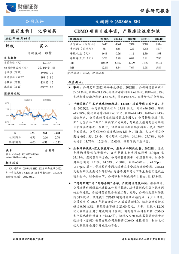 九洲药业在2022年上半年展现出强劲的业绩增长,主要得益于其CDMO业务的蓬勃发展和“做深做广”的客户战略。公司通过不断丰富项目管线,尤其是在I/II期、III期和已上市项目数量上的显著增长,巩固了其在CDMO市场的地位。为支撑未来的高速增长,九洲药业正积极推进产能扩张,通过内部新建基地和外部并购相结合的方式,并计划通过非公开发行募集资金,进一步投资于CDMO生产基地和原料药CDMO项目建设。分析师基于公司历史业绩和未来增长潜力,维持“买入”评级,并给出了积极的目标价格区间。尽管面临多种外部风险,但九洲药业的战略布局和财务表现预示着其未来持续增长的良好前景。