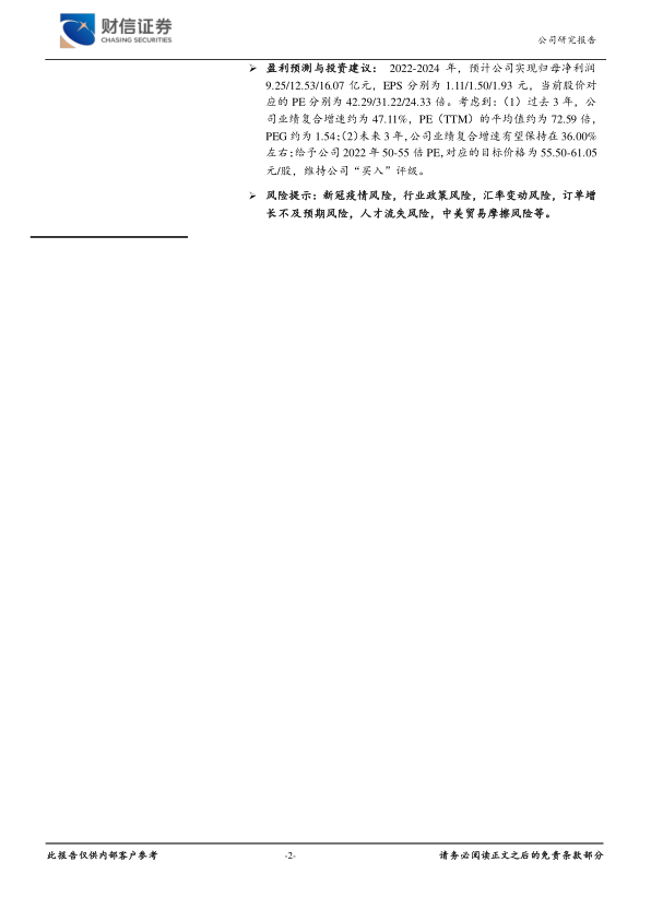 盈利预测与投资建议: 2022-2024 年,预计公司实现归母净利润9.25/12.53/16.07 亿元,EPS 分别为 1.11/1.50/1.93 元,当前股价对应的 PE 分别为 42.29/31.22/24.33 倍。考虑到:(1)过去 3 年,公司业绩复合增速约为 47.11%,PE(TTM)的平均值约为 72.59 倍,PEG 约为 1.54;(2)未来 3 年,公司业绩复合增速有望保持在 36.00%左右;给予公司 2022 年 50-55 倍 PE,对应的目标价格为 55.50-61.05元/股,维持公司“买入”评级。