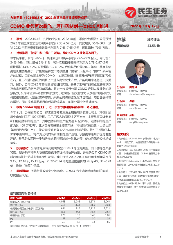 投资建议: 公司作为原料药成功转型 CDMO 的优秀典型,同下游药企关系紧密,新并购产能有力支撑后备充沛管线持续快速放量,并推动公司 CDMO 原料药和制剂一站式业务的更好发展,我们预计 2022-2024 年归母净利润分别是9.15、 12.18 及 15.11 亿元; 2022-2024 年对应当前股价的 PE 为 40、 30 和 24倍,维持“推荐”评级。
