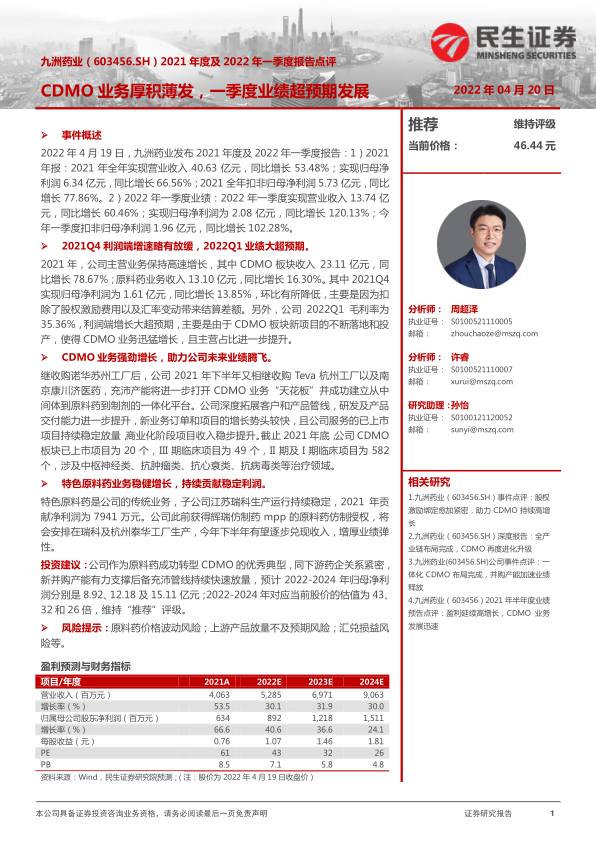 2022年4月19日,九洲药业发布2021年度及2022年一季度报告:1)2021年报:2021年全年实现营业收入40.63亿元,同比增长53.48%;实现归母净利润6.34亿元,同比增长66.56%;2021全年扣非归母净利润5.73亿元,同比增长77.86%。2)2022年一季度业绩:2022年一季度实现营业收入13.74亿元,同比增长60.46%;实现归母净利润为2.08亿元,同比增长120.13%;今年一季度扣非归母净利润1.96亿元,同比增长102.28%。