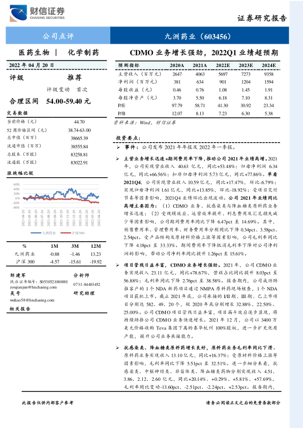 九洲药业在2021年及2022年第一季度表现出强劲的增长势头,核心驱动力在于其CDMO业务的快速发展和项目管线的持续丰富。公司通过有效的成本控制和业务结构优化,成功提升了盈利能力,尤其在2022年第一季度实现了超预期的业绩增长。此外,股权激励计划的推出,为公司未来三年的业绩增长提供了坚实的制度保障。综合考虑公司过去三年的业绩复合增速(约47.11%)和未来三年的预期复合增速(约36.00%),财信证券维持对九洲药业的“推荐”评级,并给予2022年50-55倍PE,对应目标价格为54.00-59.40元/股。