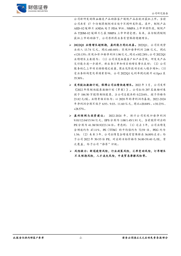 2022年第一季度,公司实现营业收入13.74亿元,同比增长60.46%;实现归母净利润2.08亿元,同比增长120.13%;实现扣非归母净利润1.96亿元,同比增长102.28%。业绩增长超预期主要得益于公司深度拓展客户和产品管线,研发及产品交付能力进一步提升,新业务订单和项目的增长势头良好,以及已上市项目持续稳定放量。