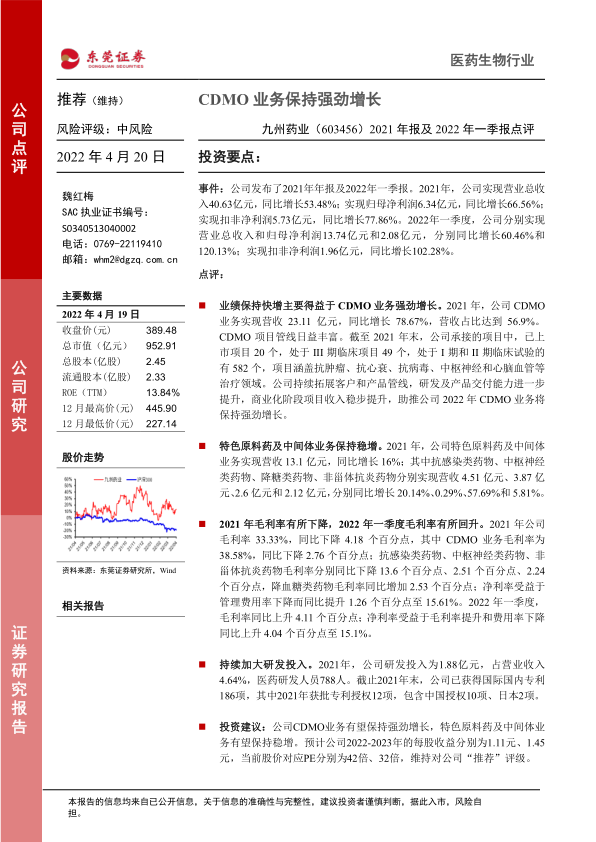 九州药业2021年报及2022年一季报显示,公司业绩快速增长主要得益于CDMO业务的强劲增长。公司持续拓展客户和产品管线,研发及产品交付能力进一步提升,商业化阶段项目收入稳步提升,助推公司CDMO业务保持强劲增长。