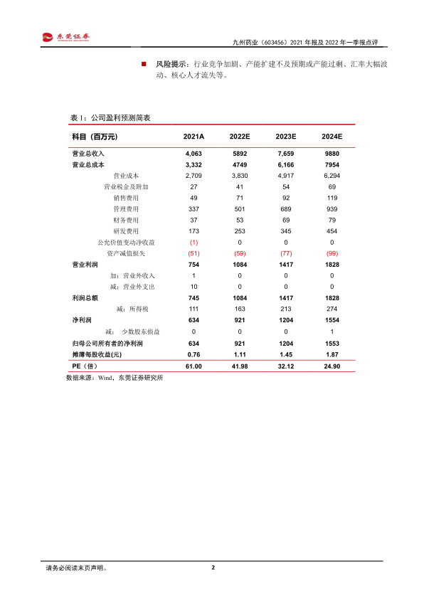 东莞证券维持对九州药业“推荐”评级,看好公司未来的发展前景。但同时也提示了行业竞争、产能风险、汇率波动和人才流失等风险因素,建议投资者谨慎判断。