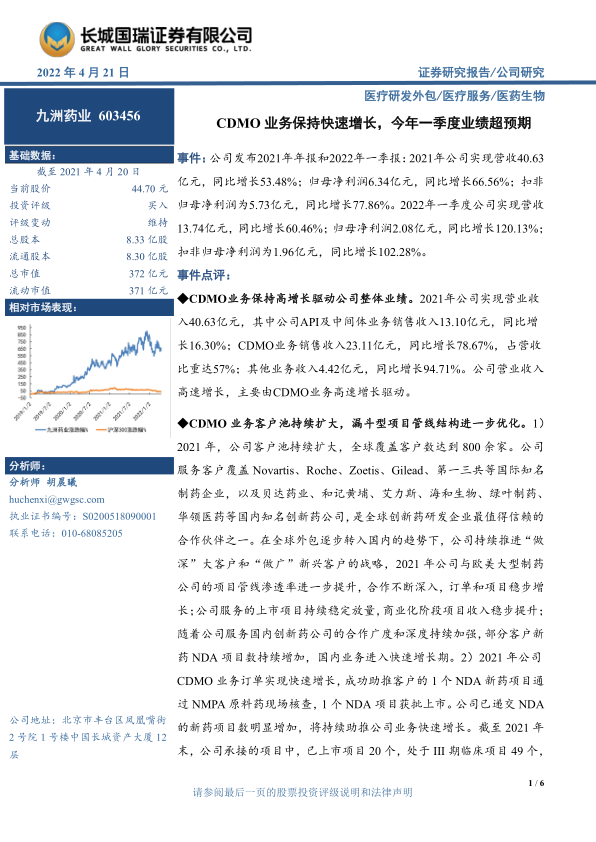 九洲药业发布了2021年年报和2022年一季报,业绩表现亮眼。