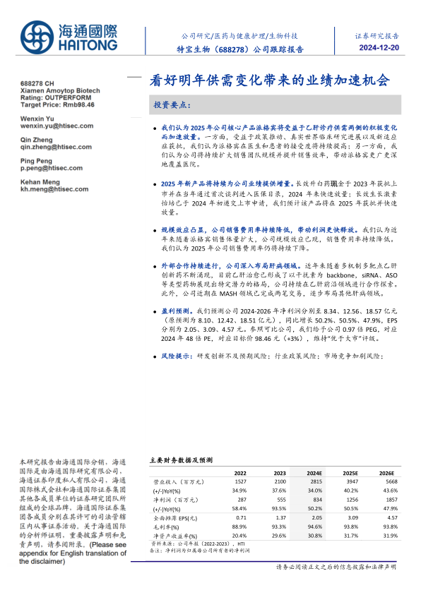 我们认为2025年公司核心产品派格宾将受益于乙肝诊疗供需两侧的积极变化而加速放量。一方面,受益于政策推动、真实世界临床研究进展以及新适应症获批,我们认为派格宾在医生和患者的接受度将持续提高;另一方面,我们认为公司将持续扩大销售团队规模并提升销售效率,带动派格宾更广更深地覆盖医院。