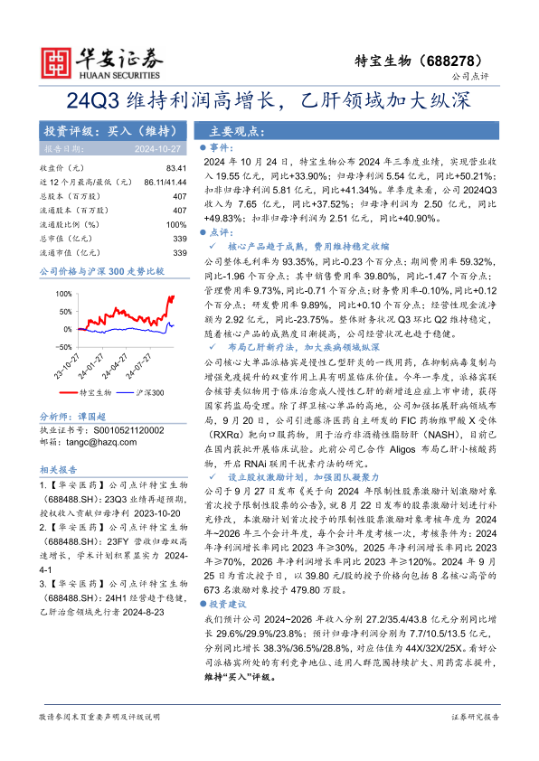 本报告对特宝生物2024年三季度业绩进行了分析,并维持“买入”评级。