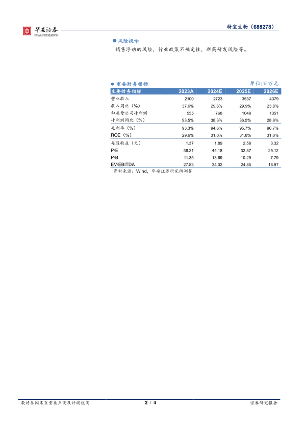 我们预计公司2024~2026年收入分别27.2/35.4/43.8亿元分别同比增长29.6%/29.9%/23.8%;预计归母净利润分别为7.7/10.5/13.5亿元,分别同比增长38.3%/36.5%/28.8%,对应估值为44X/32X/25X。看好公司派格宾所处的有利竞争地位、适用人群范围持续扩大、用药需求提升,维持“买入”评级。