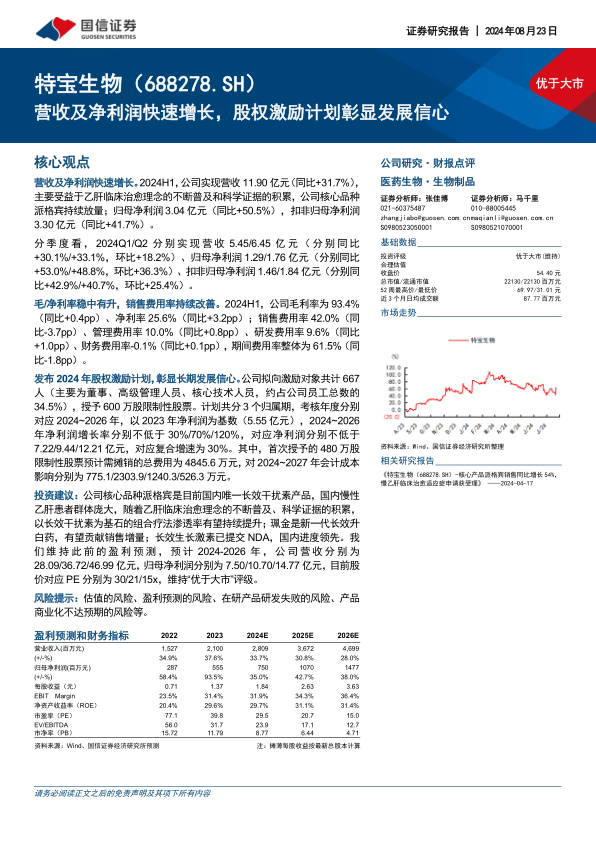 特宝生物在2024年上半年展现出强劲的财务表现,营收和净利润均实现快速增长,主要得益于核心产品派格宾的市场放量。公司盈利能力持续优化,毛利率和净利率稳中有升,同时销售费用率得到有效控制。新发布的股权激励计划设定了积极的业绩目标,彰显了公司管理层对未来发展的坚定信心。凭借派格宾、珮金以及长效生长激素等多元化的产品管线,公司具备持续增长的潜力。综合分析,维持“优于大市”的投资评级,但投资者仍需关注估值、盈利预测、研发及商业化等潜在风险。