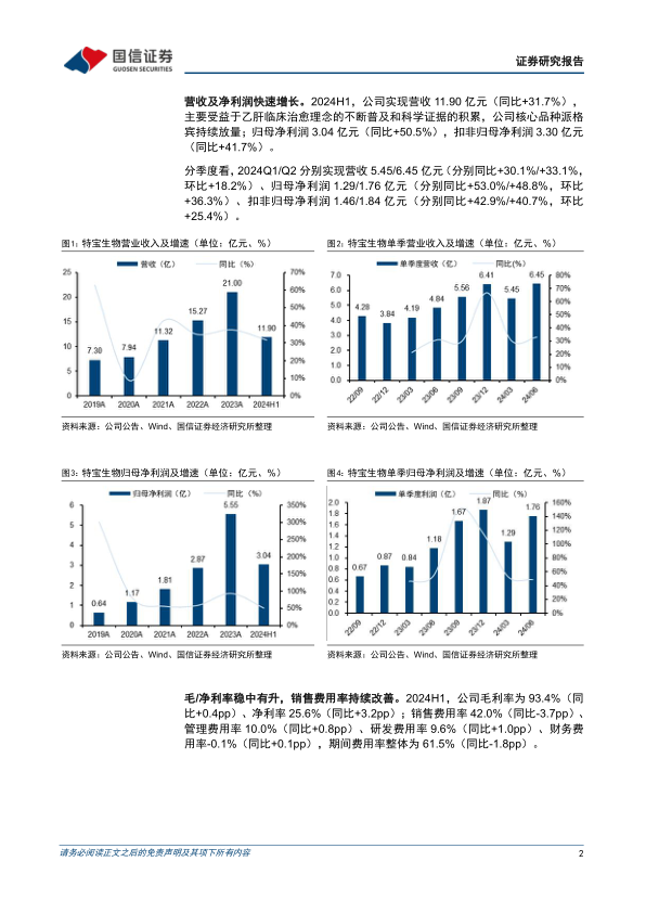 营收及净利润快速增长。2024H1,公司实现营收11.90亿元(同比+31.7%),主要受益于乙肝临床治愈理念的不断普及和科学证据的积累,公司核心品种派格宾持续放量;归母净利润3.04亿元(同比+50.5%),扣非归母净利润3.30亿元(同比+41.7%)。