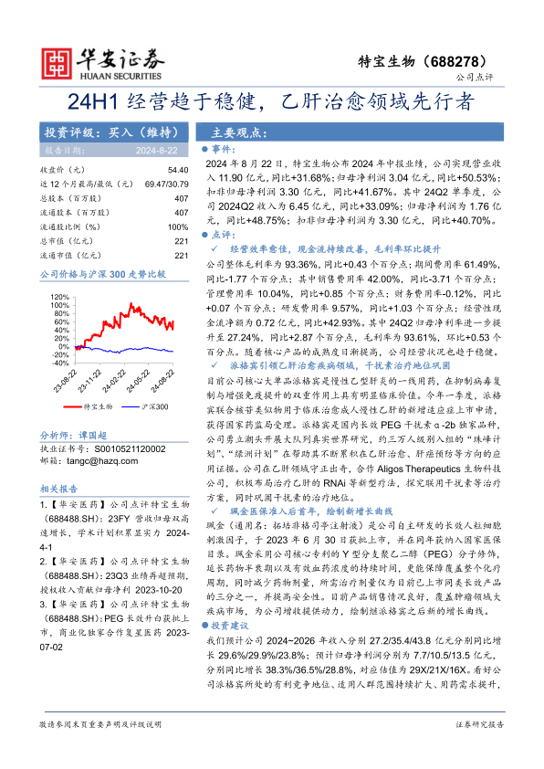 特宝生物在2024年上半年取得了显著的经营成果,营收和净利润均实现高速增长,显示出公司经营效率的持续优化和盈利能力的增强。核心产品派格宾在乙肝治疗领域保持领先地位,并通过适应症拓展和前沿疗法布局,进一步巩固了市场优势。新产品珮金成功上市并纳入医保,迅速成为公司新的业绩增长点。基于对公司核心产品竞争优势、市场需求增长以及新产品放量的预期,分析师维持“买入”评级,并预计公司未来几年将保持稳健的业绩增长。同时,报告也提示了销售、政策和研发等方面的潜在风险。