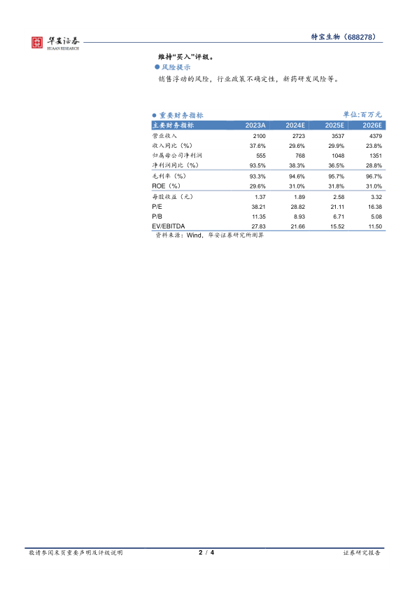 我们预计公司2024~2026年收入分别27.2/35.4/43.8亿元分别同比增长29.6%/29.9%/23.8%;预计归母净利润分别为7.7/10.5/13.5亿元,分别同比增长38.3%/36.5%/28.8%,对应估值为29X/21X/16X。看好公司派格宾所处的有利竞争地位、适用人群范围持续扩大、用药需求提升,