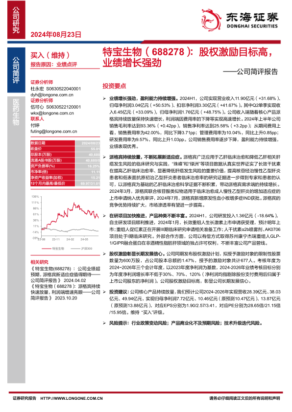 特宝生物在2024年上半年实现了强劲的业绩增长,营收和归母净利润均大幅提升,盈利能力持续增强。这主要得益于核心产品派格宾的持续放量及其新适应症的拓展。公司在研项目进展顺利,产品管线不断丰富,为未来增长奠定基础。同时,高目标的股权激励计划充分体现了公司对长期发展的信心。综合来看,公司具备持续增长潜力,维持“买入”评级,但需关注行业政策、产品商业化及技术迭代等潜在风险。